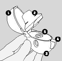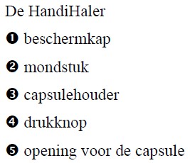 Hoe moet je de Handihaler gebruiken?1. Klap het bovenste stuk van de Handihaler open door op de groene knop te drukken. Het mondstuk is nu zichtbaar. 2. Open het mondstuk door het naar boven te klappen. De capsulekamer is nu zichtbaar.3. Haal een capsule uit de bijgelverde verpakking en plaats deze in de opening in de capsulekamer. 4. Sluit het mondstuk terug door het weer dicht te klappen. Als je een 'klik' hoort is het gesloten.De beschermkap blijft open.5. Druk de groene knop in één keer helemaal in. Er worden nu gaatjes in de capsule geprikt zodat het poeder bij het inhaleren kan vrijkomen.6. Adem uit weg van het toestel.7. Houd het hoofd recht en buig lichtjes achterover. Neem het toestel in de mond en sluit het mondstuk af met de lippen.8. Adem zo krachtig en zo diep mogelijk in langs de mond.9. Haal het toestel uit de mond en houd nog 5-10 tellen de adem in.10. Herhaal stap 6-9. 11. Open opnieuw het mondstuk zodat de capsulekamer zichtbaar wordt. Zit er nog poeder in de capsule? Herhaal dan nog eens stap 6-9.12. Sluit het mondstuk en de beschermkap.Als uw puffer cortisonen bevat dan moet je na het inhaleren de mond spoelen. Gorgel 2 keer en spuw het spoelwater uit.Aanbevelingen:- Adem nooit uit in de Handihaler.- Slik de capsules niet in !- Neem enkele de capsule uit de blister die je nodig hebt. Bewaar de andere capsules in de blisterverpakking.- Gebruik altijd het bijgeleverde nieuwe toestel als je een nieuw doosje begint. Bewaring:- Bewaar de Handihaler en de capsules op een droge en koele plaats.